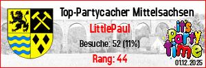 | 44 | LittlePaul | 52 (11%) | <p align='center'><a href = 'https://www.geocaching-county-stats.de/mittelsachsen.html'><img src = 'https://www.geocaching-county-stats.de/toppartycacher.php?county=Mittelsachsen&mid=11809237'></a></p> |