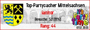 | 44 | ianitor | 52 (11%) | <p align='center'><a href = 'https://www.geocaching-county-stats.de/mittelsachsen.html'><img src = 'https://www.geocaching-county-stats.de/toppartycacher.php?county=Mittelsachsen&mid=1215614'></a></p> |